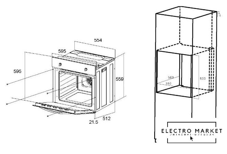 электрический с конвекцией, объем 60 л, утапливаемые переключатели, 6 режимов, очистка паровая, направляющие проволочные