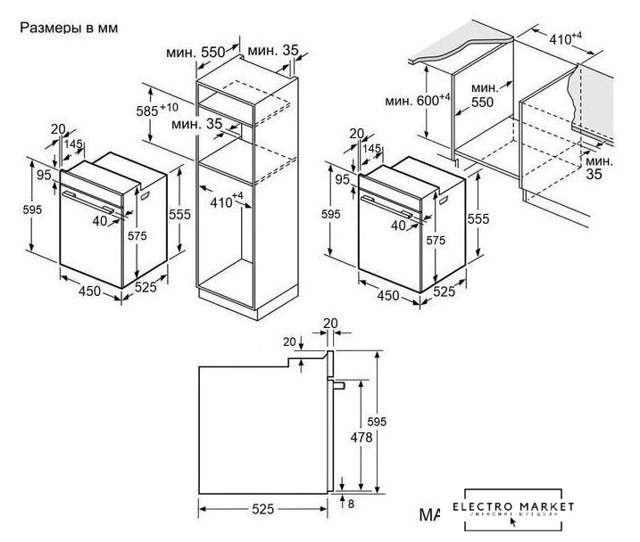 электрический с конвекцией, объем 66 л, 8 режимов, очистка ручная, 3 стекла в дверце, направляющие проволочные