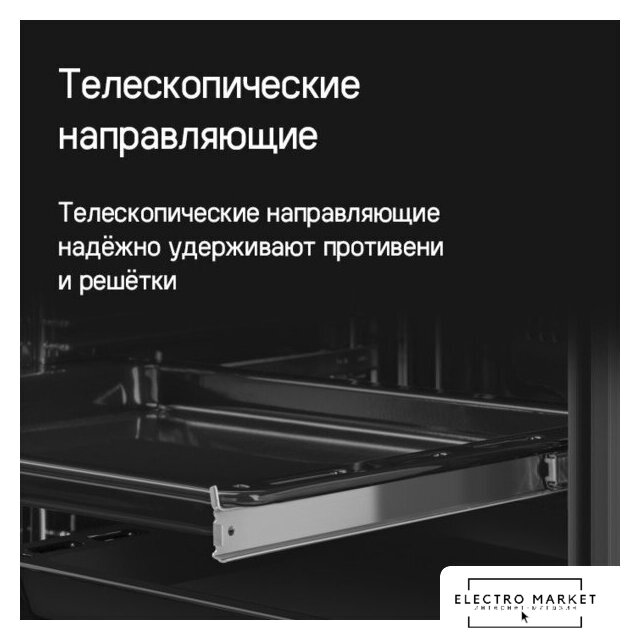 электрический с конвекцией, объем 72 л, утапливаемые переключатели, 9 режимов, автопрограммы, очистка каталитическая + паровая, направляющие проволочные + телескопические (1 уровень), термощуп