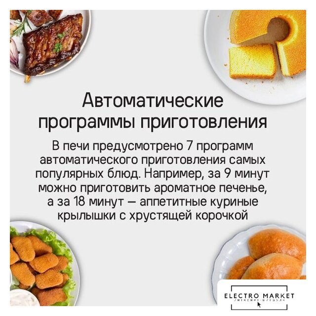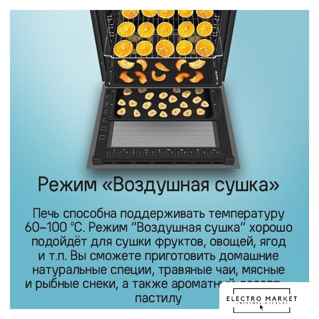 | Дополнительные режимы | ПРИНУДИТЕЛЬНАЯ КОНВЕКЦИЯ3D-КОНВЕКЦИЯАЭРОФРИТЮРВОЗДУШНАЯ СУШКАПИЦЦА |