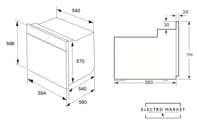 электрический с конвекцией, объем 60 л, утапливаемые переключатели, 10 режимов, очистка ручная, 3 стекла в дверце, направляющие проволочные