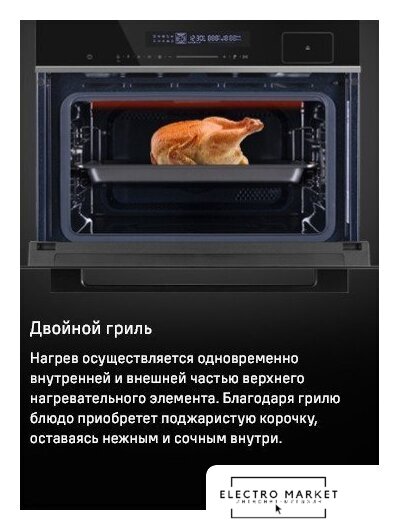 | Режимы работы | нижний нагрев, двухсторонний нагрев, большой гриль, гриль + конвекция, нижний нагрев + конвекция, двухсторонний + вентиляционный нагрев (3D), размораживание |