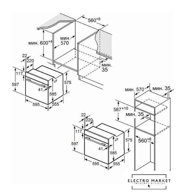 электрический с конвекцией, объем 67 л, утапливаемые переключатели, 6 режимов, очистка ручная, 3 стекла в дверце, направляющие проволочные