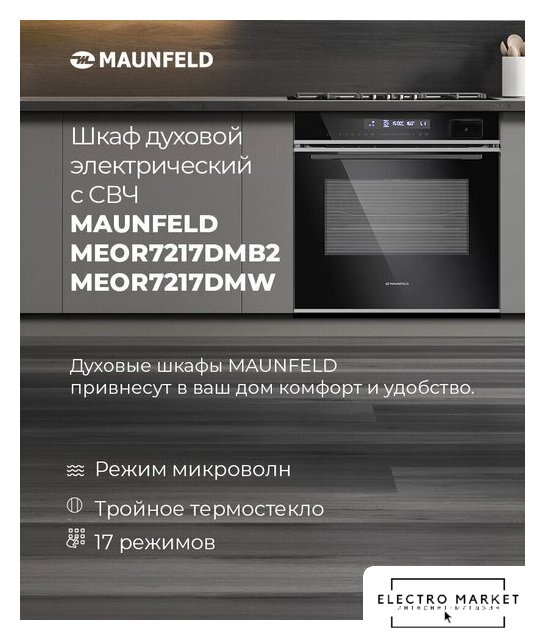 электрический с конвекцией, объем 72 л, 17 режимов, очистка каталитическая + паровая, направляющие проволочные + телескопические (1 уровень)