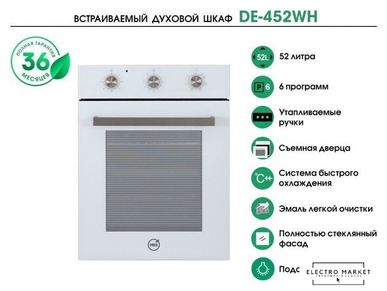 электрический с конвекцией, объем 69 л, 14 режимов, очистка паровая, 2 стекла в дверце, направляющие проволочные + телескопические (1 уровень)