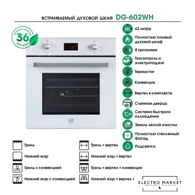 газовый с конвекцией, объем 45 л, 5 режимов, очистка ручная/каталитическая, проволочные направляющие, телескопические направляющие