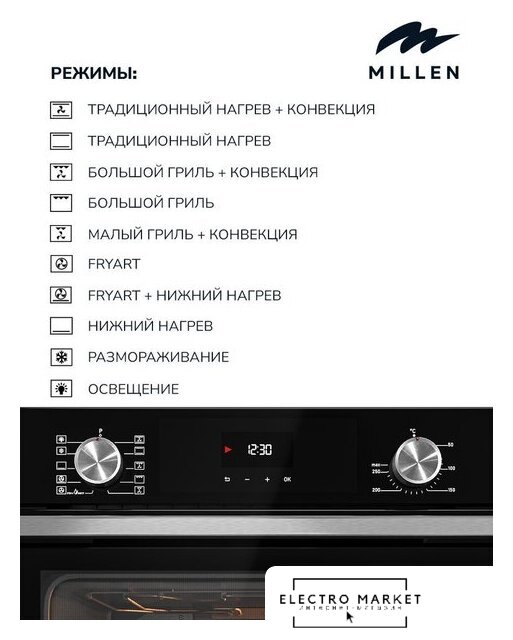 | Режимы работы | нижний нагрев, двухсторонний нагрев, большой гриль, вентиляционный нагрев, гриль + конвекция, нижний + вентиляционный нагрев, двухсторонний нагрев + конвекция, размораживание |