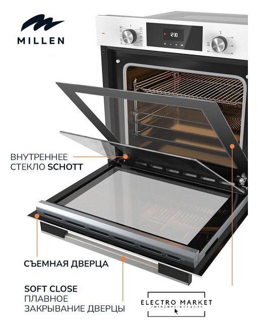 электрический с конвекцией, объем 55 л, автопрограммы, очистка ручная, 3 стекла в дверце, направляющие проволочные + телескопические