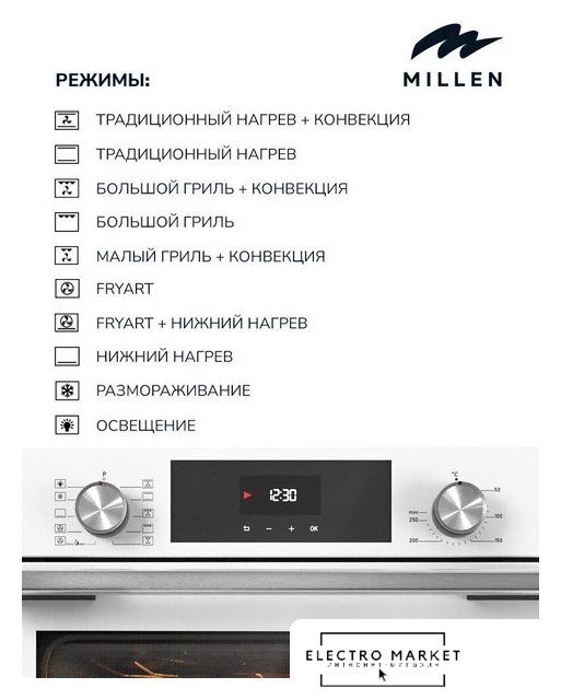 | Режимы работы | нижний нагрев, двухсторонний нагрев, большой гриль, вентиляционный нагрев, гриль + конвекция, нижний + вентиляционный нагрев, двухсторонний нагрев + конвекция, размораживание |
