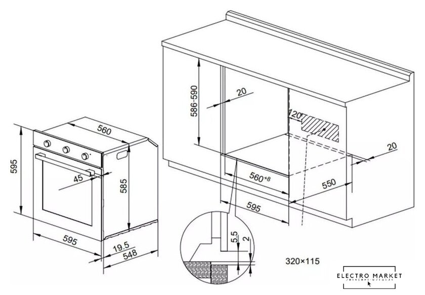 электрический с конвекцией, объем 55 л, утапливаемые переключатели, 7 режимов, очистка ручная, 2 стекла в дверце, направляющие проволочные