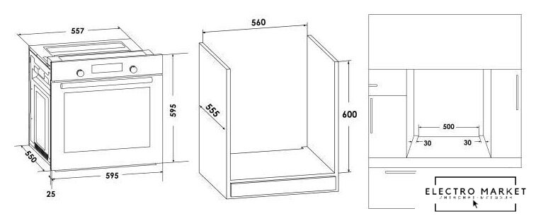 электрический с конвекцией, объем 55 л, утапливаемые переключатели, 7 режимов, очистка ручная, 2 стекла в дверце, направляющие проволочные