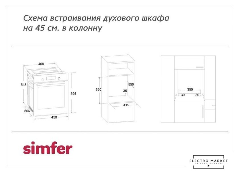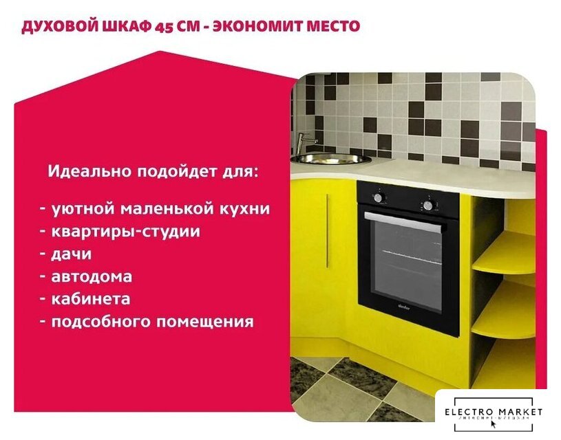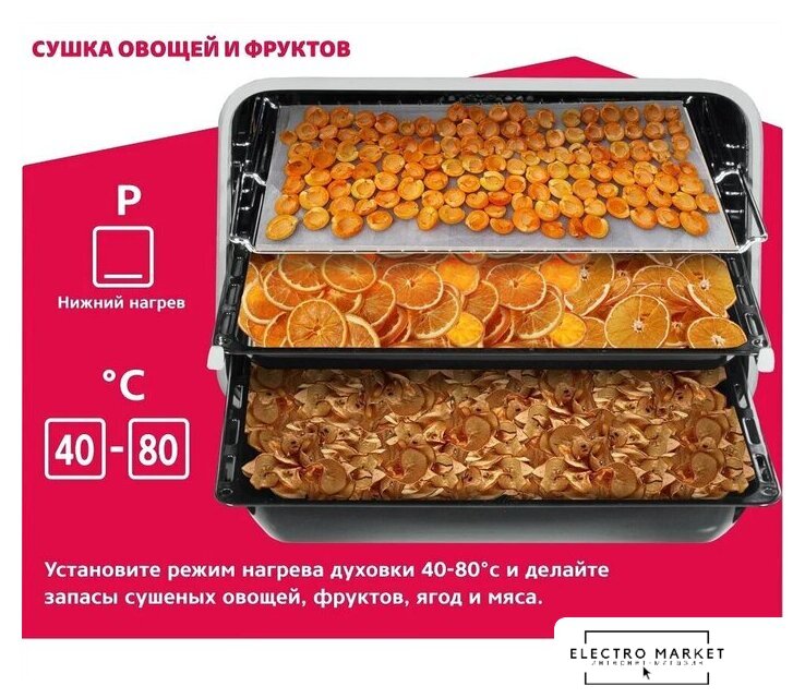 электрический с конвекцией, объем 73 л, утапливаемые переключатели, 8 режимов, очистка паровая, 2 стекла в дверце, направляющие проволочные