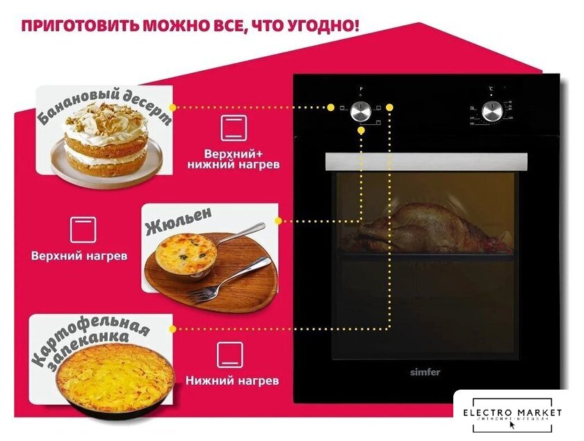 электрический с конвекцией, объем 58 л, 10 режимов, очистка ручная, 2 стекла в дверце, направляющие проволочные + телескопические (2 уровня)