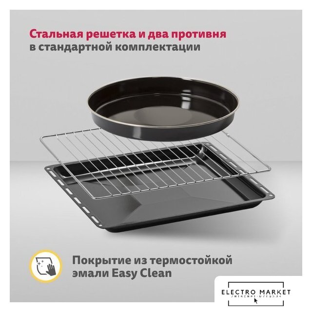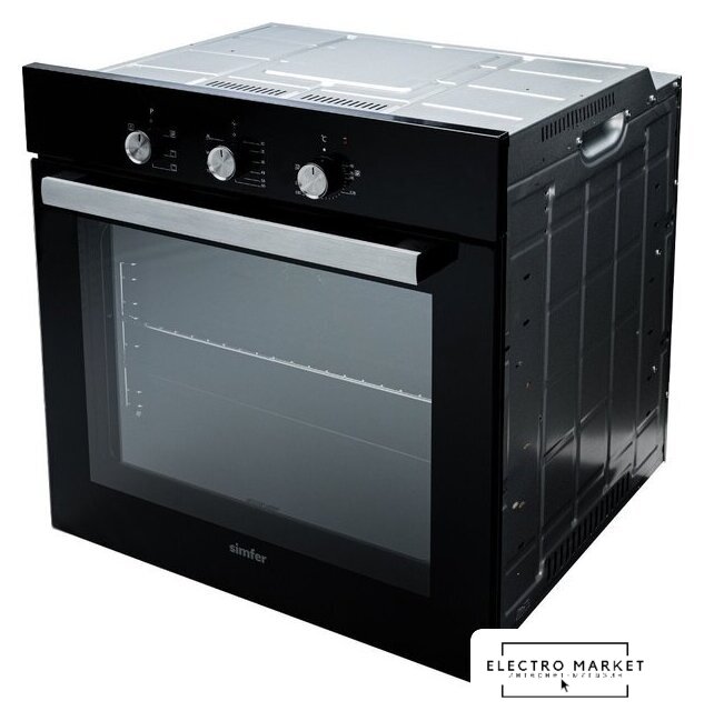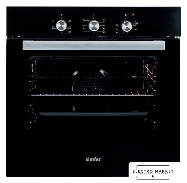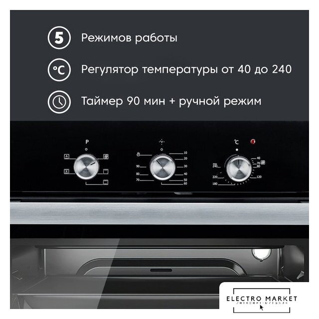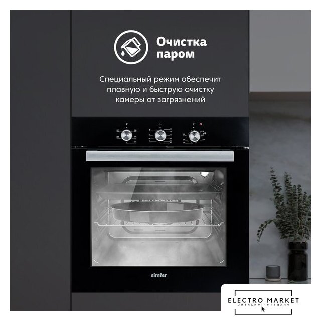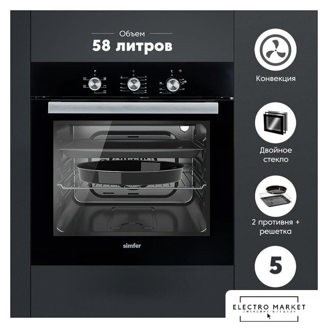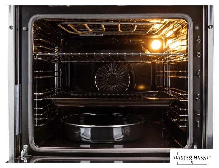 электрический с конвекцией, объем 60 л, утапливаемые переключатели, 8 режимов, очистка ручная, направляющие проволочные + телескопические