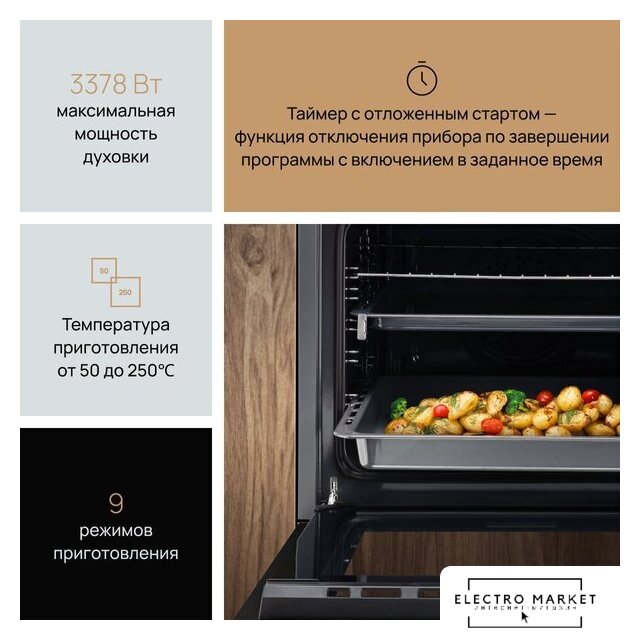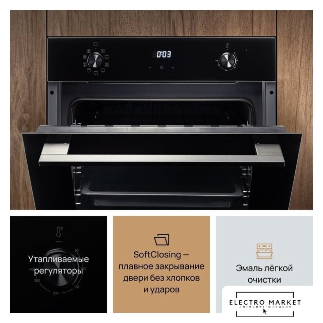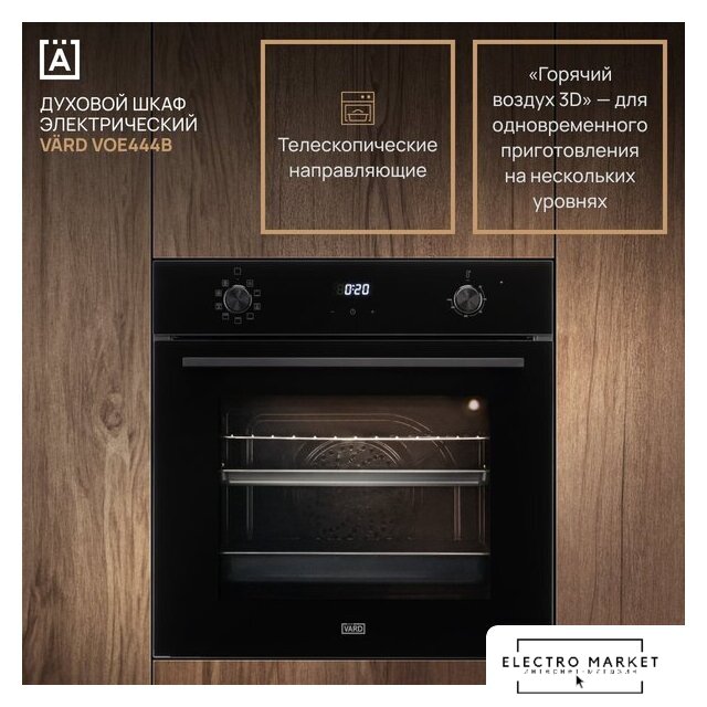электрический с конвекцией, объем 75 л, 9 режимов, очистка ручная, направляющие проволочные + телескопические (1 уровень), термощуп