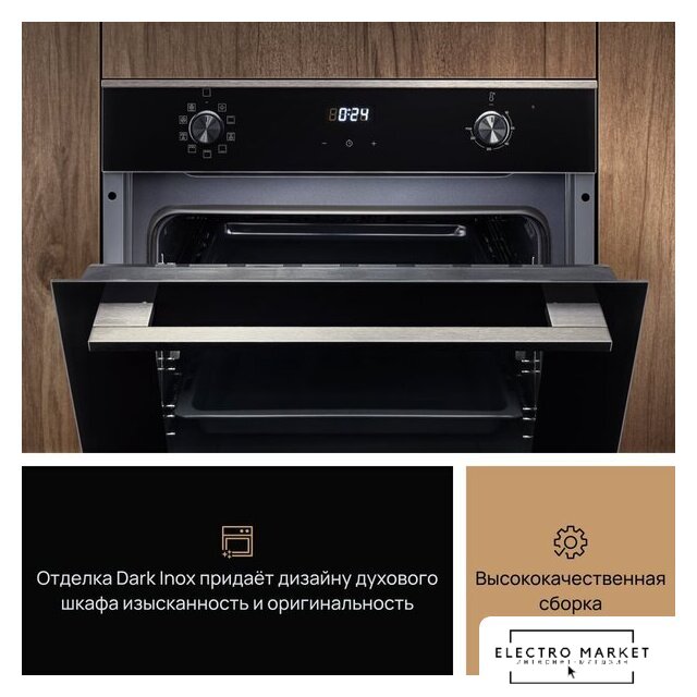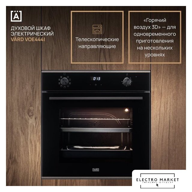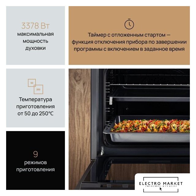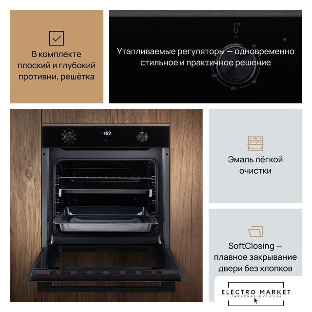 электрический с конвекцией, объем 65 л, 9 режимов, очистка паровая, направляющие проволочные
