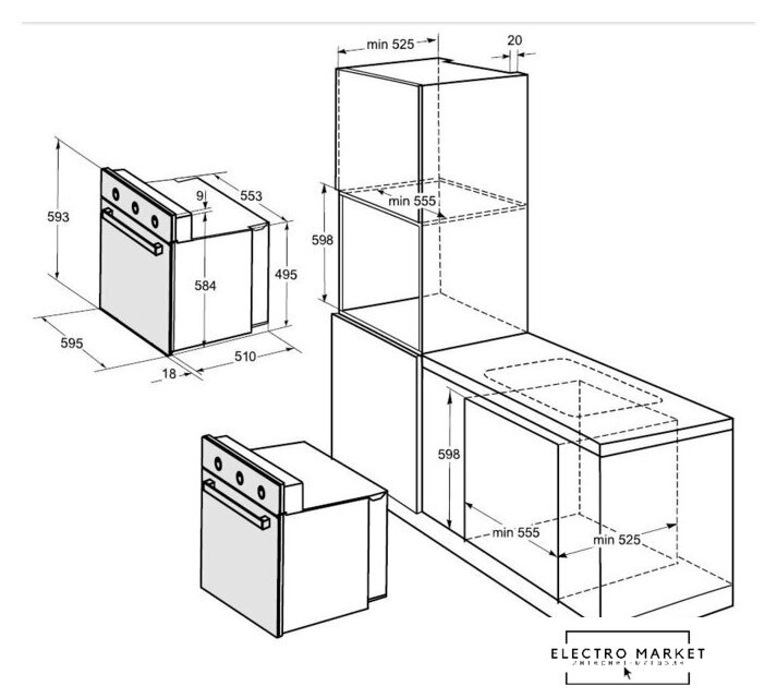 электрический с конвекцией, объем 55 л, 7 режимов, очистка паровая, направляющие проволочные