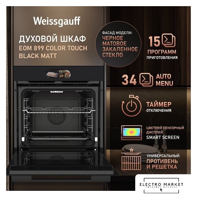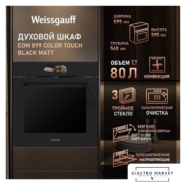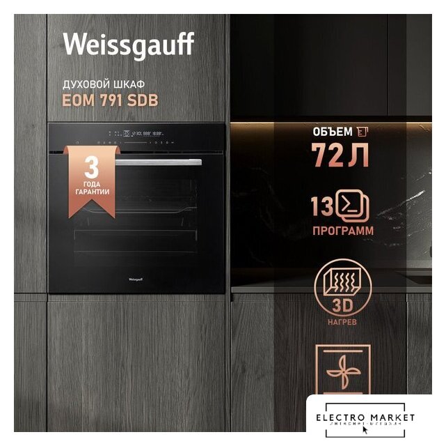 электрический с конвекцией, объем 72 л, 11 режимов, очистка каталитическая + паровая, направляющие проволочные + телескопические (1 уровень), термощуп