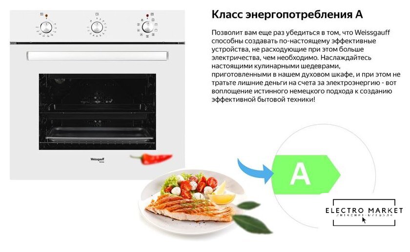 электрический с конвекцией, объем 49 л, 3 режима, очистка паровая, проволочные направляющие, энергопотребление A