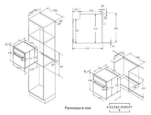 электрический с конвекцией, объем 49 л, 5 режимов, очистка каталитическая, проволочные направляющие, энергопотребление A