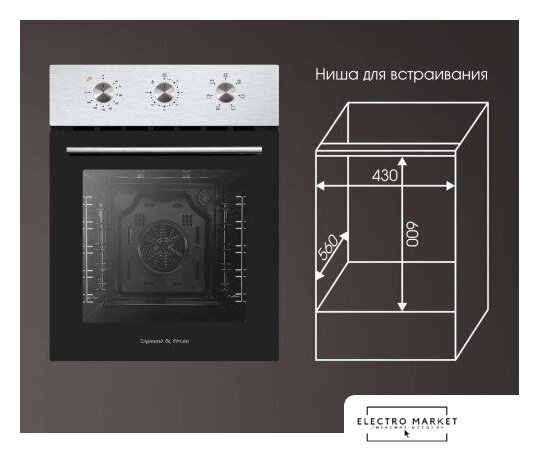 электрический с конвекцией, объем 60 л, утапливаемые переключатели, 6 режимов, очистка паровая, направляющие проволочные