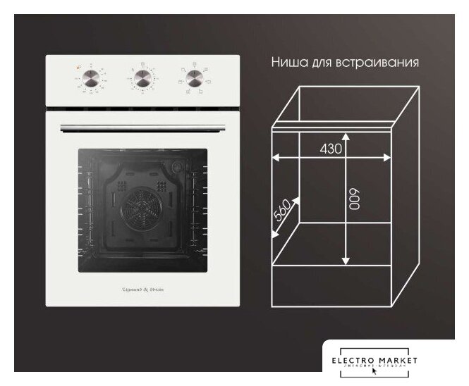 электрический статический, объем 60 л, утапливаемые переключатели, 3 режима, очистка паровая, 3 стекла в дверце