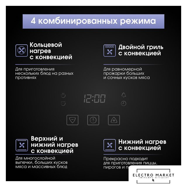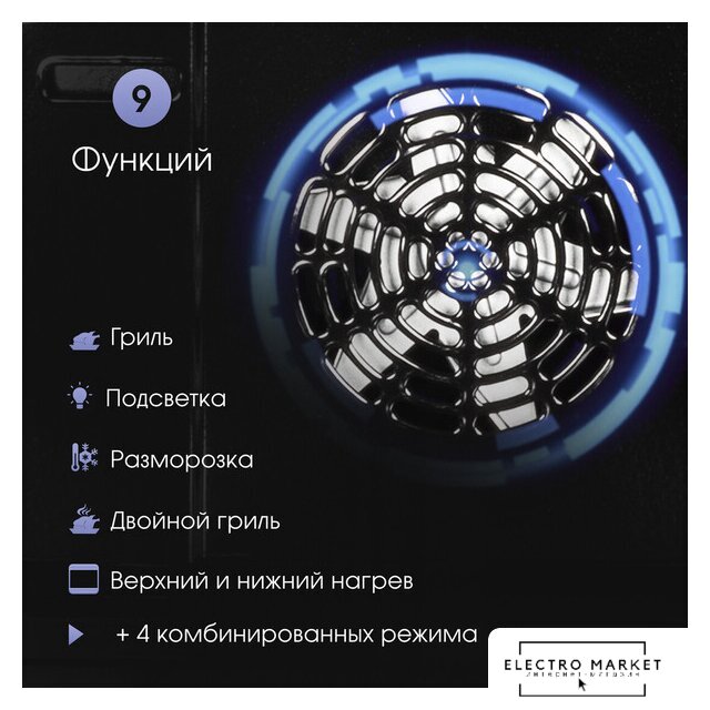 Режимы работы | двухсторонний нагрев, большой гриль, гриль + конвекция, нижний нагрев + конвекция, двухсторонний нагрев + конвекция, двухсторонний + вентиляционный нагрев (3D) |
