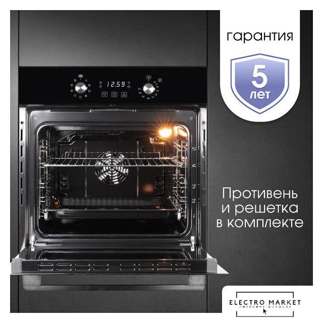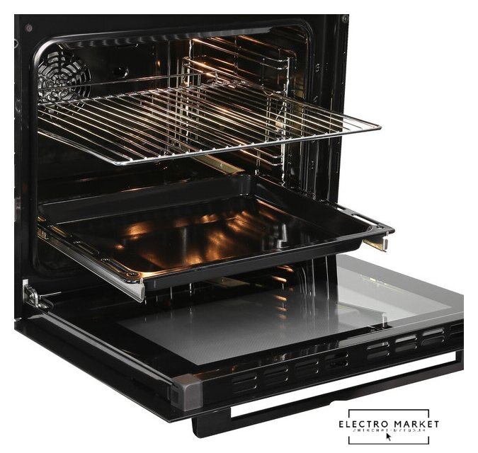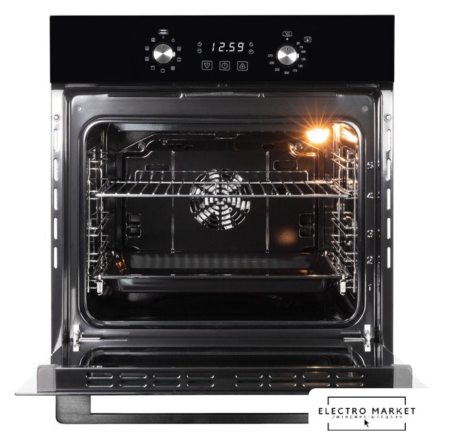 электрический с конвекцией, объем 72 л, 6 режимов, очистка ручная, 2 стекла в дверце, направляющие проволочные