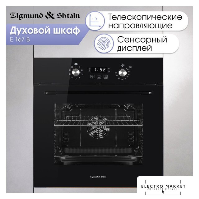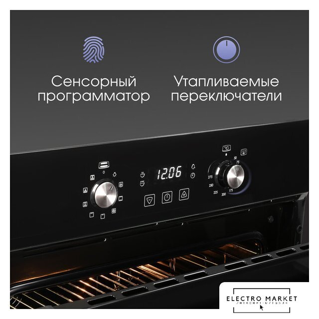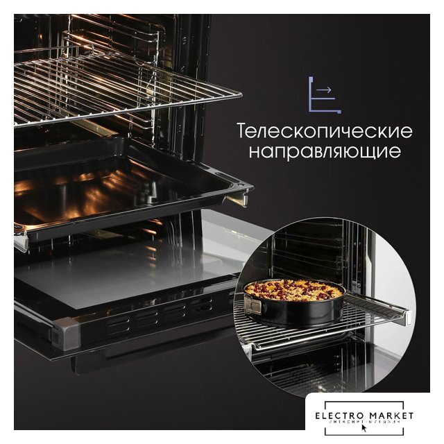 электрический с конвекцией, объем 70 л, утапливаемые переключатели, 7 режимов, очистка паровая, 2 стекла в дверце, направляющие проволочные + телескопические (1 уровень)