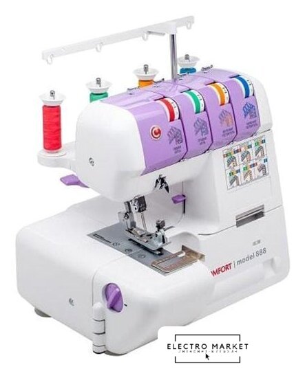 оверлок, рабочих нитей: 2, 3, 4, максимальная ширина строчки: 6.5 мм, максимальная длина строчки: 5 мм, регулировка давления лапки, скорость шитья: 1200 об/мин