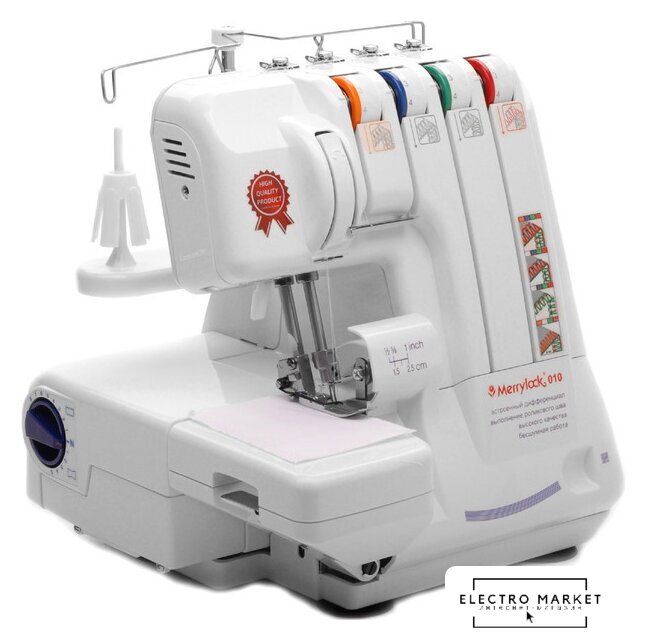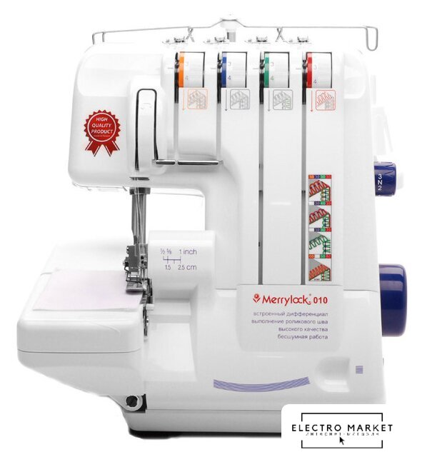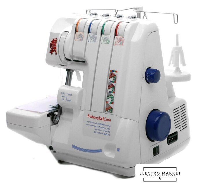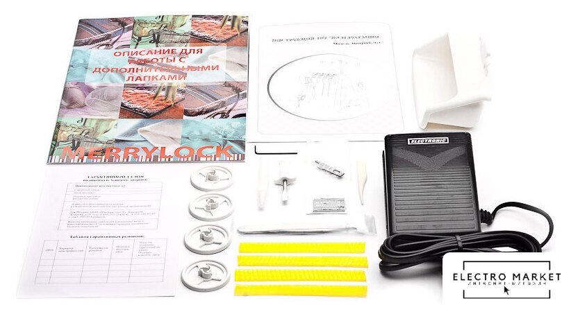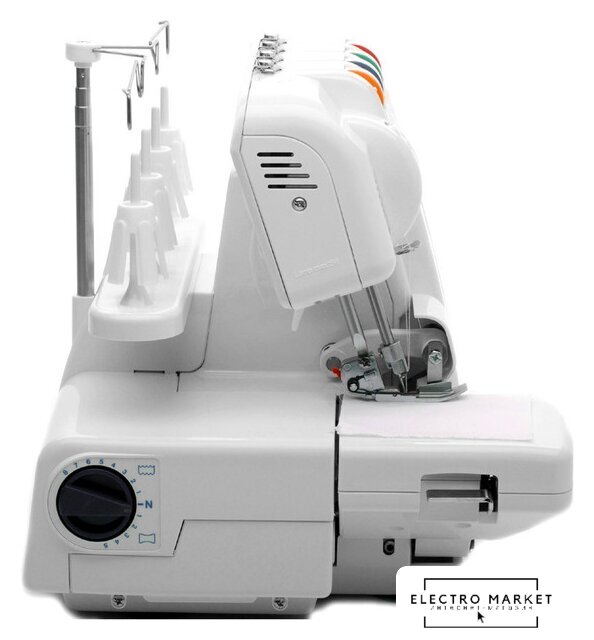оверлок; рабочих нитей: 4; нитей для плоского шва: 3; максимальная ширина строчки: 7 мм; максимальная длина строчки: 4 мм; регулировка давления лапки; скорость шитья: 1300 об/мин