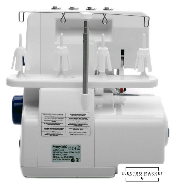 оверлок; рабочих нитей: 3, 4; максимальная ширина строчки: 5 мм; максимальная длина строчки: 4 мм; регулировка давления лапки; скорость шитья: 1200 об/мин