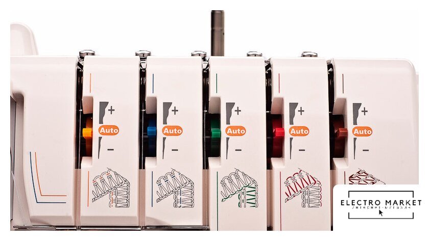 оверлок; рабочих нитей: 2, 3, 4, 5; нитей для плоского шва: 2, 3; максимальная ширина строчки: 8.5 мм; регулировка давления лапки; скорость шитья: 1300 об/мин