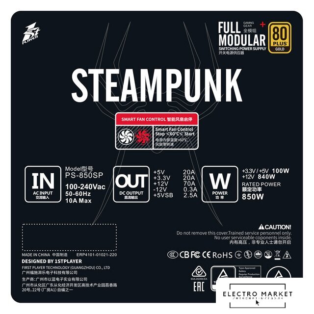 ATX 850 Вт, активная PFC, золотой сертификат, вентилятор 1x120 мм, 1x 12В 70.5А, 1x PCIe Gen5
