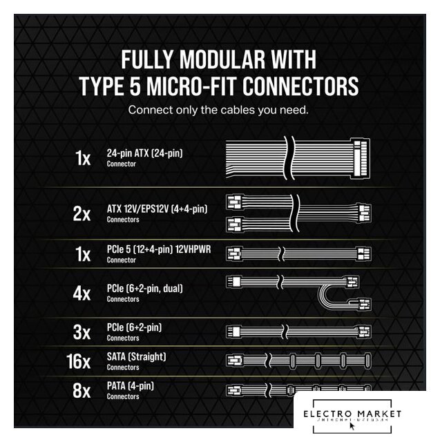 ATX 1000 Вт, активная PFC, платиновый сертификат, вентилятор 1x135 мм, модульные кабели, 1x 12В 83.3А, 1x PCIe Gen5