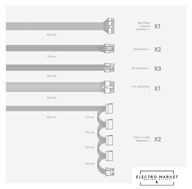 ATX 750 Вт, активная PFC, золотой сертификат, вентилятор 1x120 мм, 1x 12В 62.5А, 1x PCIe Gen5