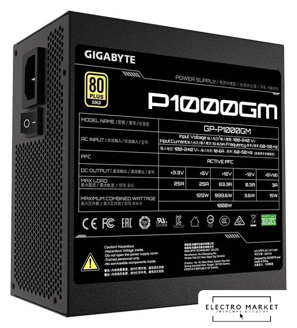 ATX 1000 Вт, активная PFC, золотой сертификат, вентилятор 1x140 мм, модульные кабели, 1x 12В 83.3А
