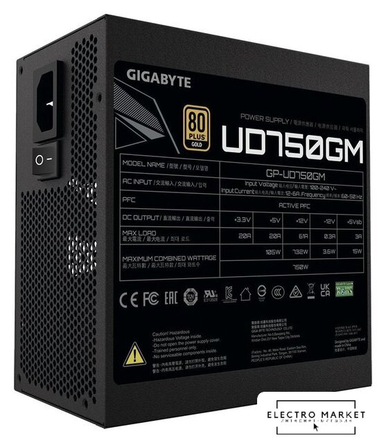 ATX 750 Вт, активная PFC, золотой сертификат, вентилятор 1x120 мм, модульные кабели, 1x 12В 62А, 1x PCIe Gen5