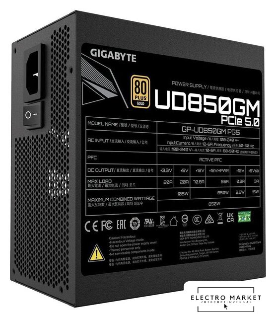 ATX 850 Вт, активная PFC, золотой сертификат, вентилятор 1x120 мм, модульные кабели, 1x 12В 70.8А, 1x PCIe Gen5