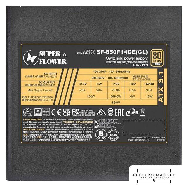 ATX 850 Вт, активная PFC, золотой сертификат, вентилятор 1x120 мм, модульные кабели, 1x 12В 70.8А, 1x PCIe Gen5