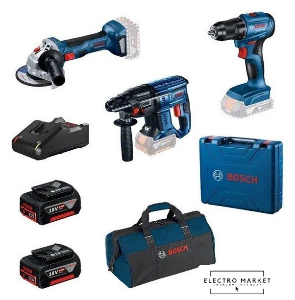 | Комплектация | - Аккумуляторная дрель-шуруповёрт Bosch GSR 185-LI- Аккумуляторный перфоратор Bosch GBH 180-LI- Аккумуляторная болгарка Bosch GWS 180-LI- 2 аккумулятора 18 В 4.0 Ач- Зарядное устройство Bosch GAL 18V-40- Сумка |