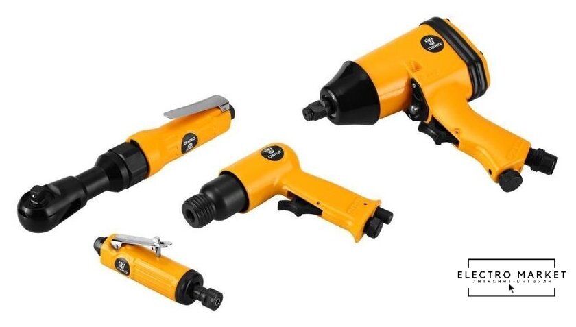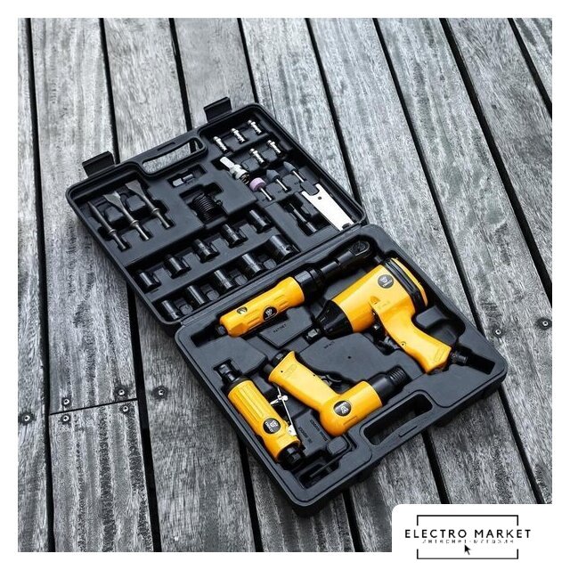 Состав набора | пневмогайковерт, пневмодолото, пневмотрещотка, пневмошлифмашинка |
