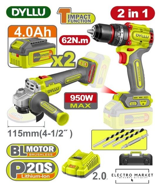 | Состав набора | дрель-шуруповерт, угловая шлифовальная машина |