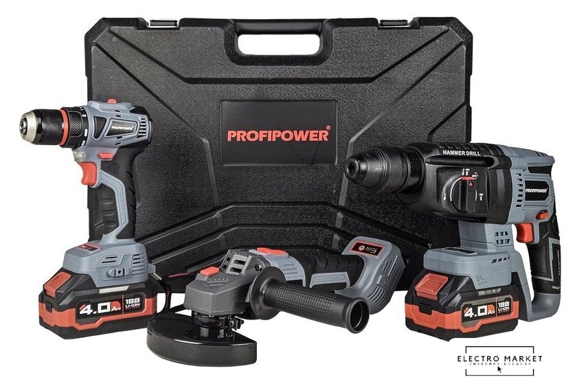 Состав набора | дрель-шуруповерт, перфоратор, угловая шлифовальная машина |
