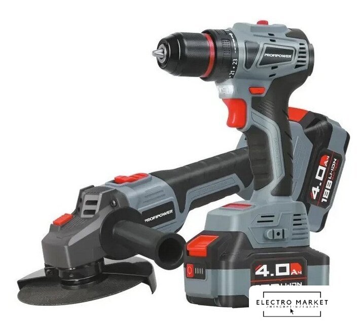 | Состав набора | дрель-шуруповерт, угловая шлифовальная машина |