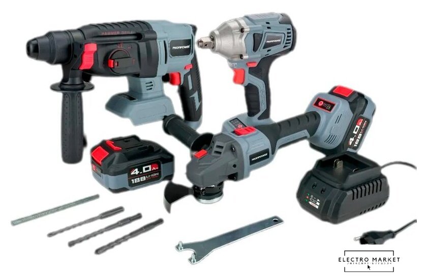 Состав набора | гайковерт, перфоратор, угловая шлифовальная машина |