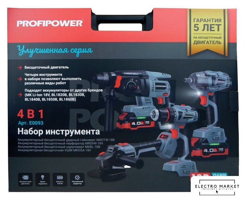 Комплектация | - Гайковерт E0081;- УШМ E0080;- Шуруповерт T0056;- Перфоратор T0058;- Набор оснастки;- Аккумуляторы - 4,0 Ач - 2шт;- Зарядное устройство;- Кейс;- Инструкции с гарантийным талоном. |