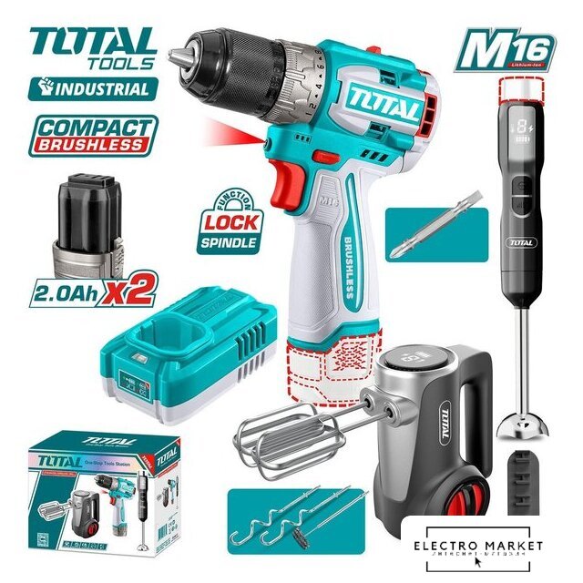 Комплектация | - Дрель-шуруповерт TDLI16681 - 1 шт.- Аккумулятор TFBLI1620 2,0 А*ч - 2 шт.- Зарядное устройство TFCLI1613 - 1 шт.- Двухсторонняя бита Cr-V 65 мм - 1 шт.- Аккумуляторный погружной блендер TOTAL TJB047K - 1 шт.- Нож для блендера из нержавеющей стали - 2 шт.- Аккумуляторный миксер TOTAL TMK022K - 1 шт.- Венчики - 2 шт.- Крючки для взбивания - 2 шт.- Вспениватель молока - 1 шт.- Подставка для удобства хранения - 1 шт.- Коробка |