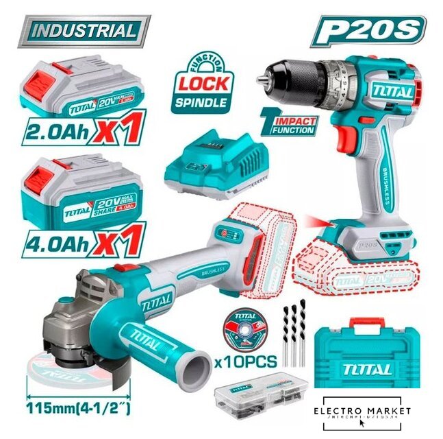 Комплектация | Дрель-шуруповерт TOTAL TIDLI206681 - 1 шт. Угловая шлифмашина TOTAL TAGLI21154 - 1 шт. Аккумулятор 2,0 А*ч - 1 шт. Аккумулятор 4,0 А*ч - 1 шт. Быстрое зарядное устройство - 1 шт. Боковая рукоятка - 1 шт. Защитный кожух - 1 шт. Фланцевый ключ - 1 шт. Отрезной диск - 10 шт. Набор набор аксессуаров 47 шт. Инструкция Кейс |