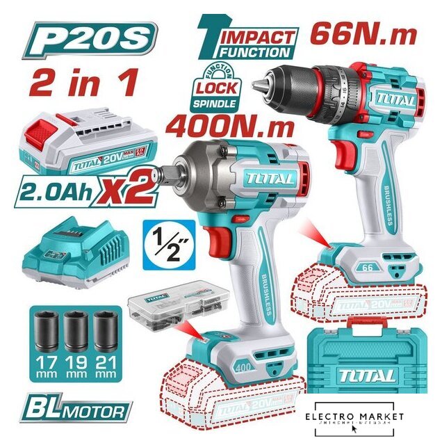 | Комплектация | Дрель-шуруповерт ударная TOTAL TIDLI206681 - 1 шт.Гайковерт TOTAL TIWLI20401 - 1 шт.Аккумулятор 2,0 Ач TFBLI20011 - 2 шт.Зарядное устройство TFCLI2001 - 1 шт.Аксессуары для дрели шуруповерта - 47 шт.Торцевые головки (17, 19, 21 мм) - 3 шт.ИнструкцияКейс |